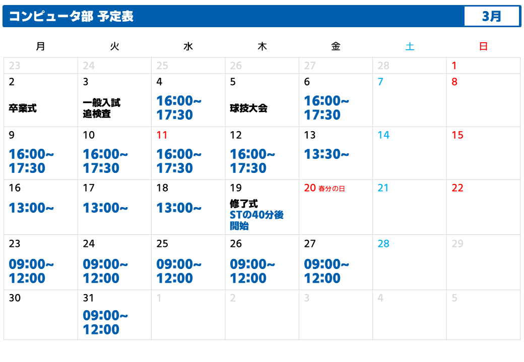 | 4月 | 1年生入部 国家試験(情報処理技術者試験) |